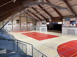 Vi spiller i Listahallen. Hallen blir delt i tre med skillevegger, slik at hver klasse får sitt eget område.